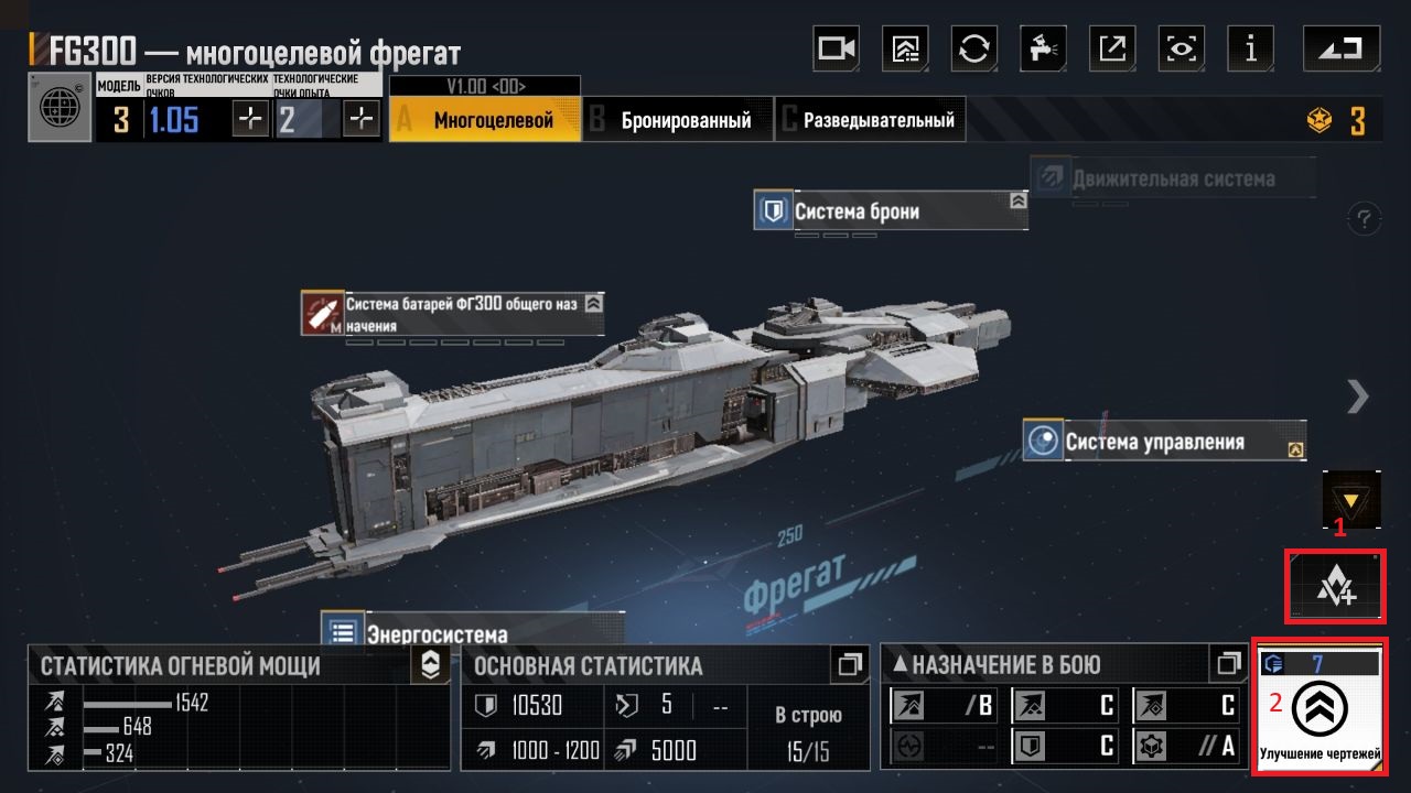 В открывшемся окне нажать на 1 (добавление очков улучшения к чертежу) или 2 (улучшение чертежа).